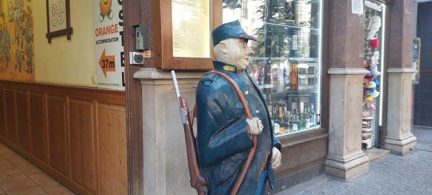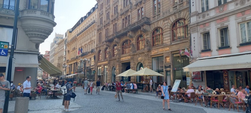 Ca de obicei nu am stat pe cât ar fi trebuit și am văzut doar ce era obligatoriu de văzut. Am ajuns aici cu mașina familiei după o oprire anterioară în Ungaria, altfel distanța Sibiu-Praga însumează peste 1000 km. Ne-am cazat la Hotel Plaza, foarte aproape de Vltava, de stații de tramvai, autobuz și metrou. Conform obiceiului aveam micul dejun (bufet suedez) asigurat, o a doua masă am luat-o fie în oraș, fie la restaurantul hotelului și pe drum uneori gustări din gastronomia locală, de regulă patiserie. Aici am servit o specialitate de kurtos cu înghețată, trdelnik în cehă. Pentru un român cu venituri medii prețurile nu erau din cele mai mici, dar noi alegem, în măsura în care se poate, feluri de mâncare cu prețuri rezonabile. Uneori ne mai facem și de cap. Spre exemplu, acum în Praga, ai mei au ales un restaurant aflat în centru, haios pentru modul în care sunt serviți clienții. Restaurantul se numește ,,Vytopna Railway Restaurant” și, cum probabil v-ați dat seama, trenulețul electric aduce comanda la mese, iar clienții sunt de toate vârstele.