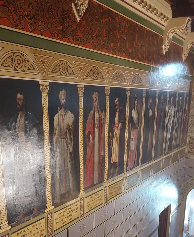 În sala centrală există o galerie de picturi murale realizate pe piele de Cordoba. Picturile reprezintă portrete ale unor membrii importanți ai familiei Cantacuzino. Nu cred că mai există ceva asemănător în țară. Tot acolo se găsesc reprezentări ale unor blazoane aparținând familiilor boierești înrudite cu Cantacuzinii.