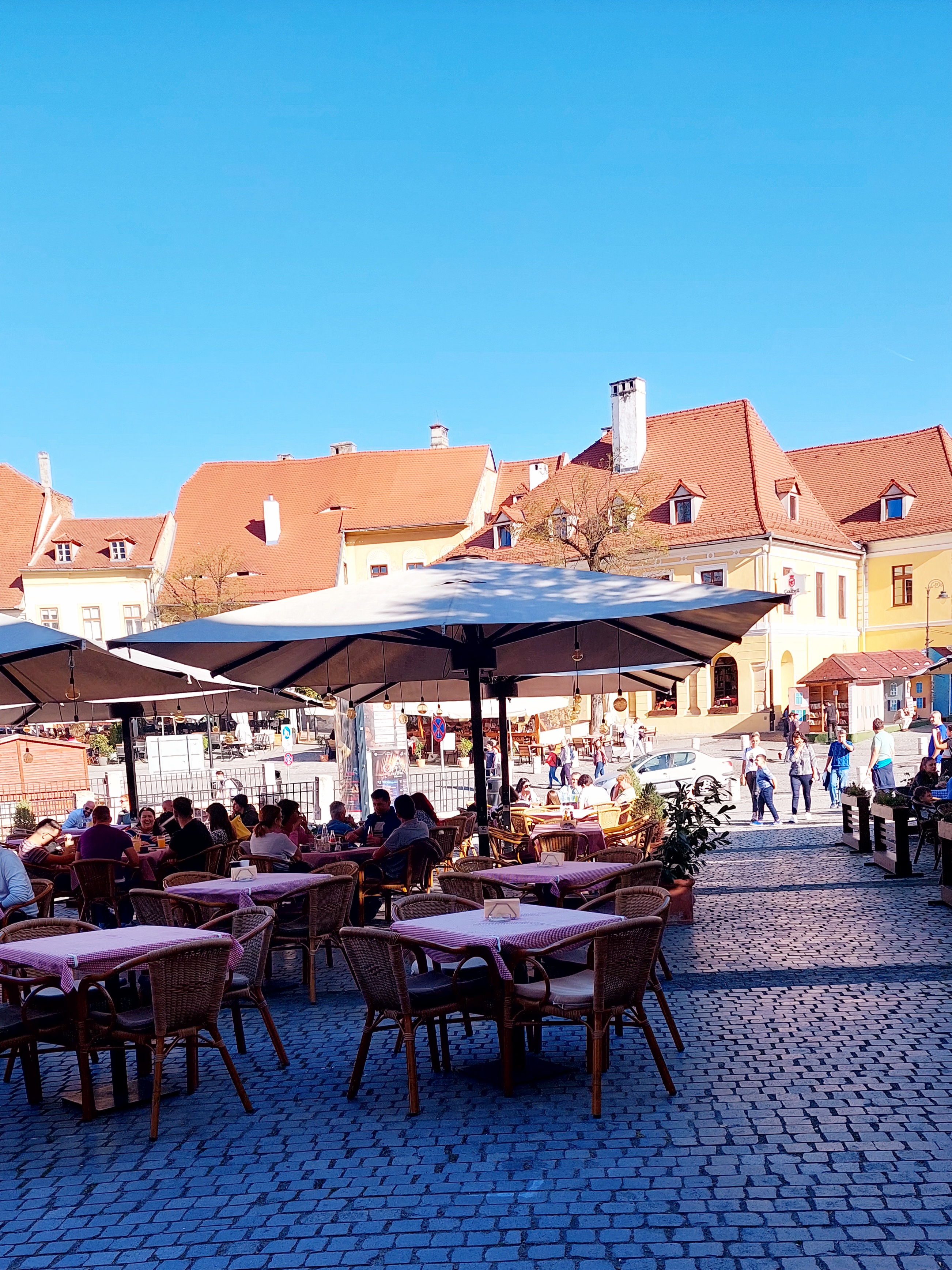 De pe terasa localului, de obicei plină de lume, poți admira Turnul Sfatului și celelalte clădiri istorice. În zona pietonală se perindă valuri de turiști. Uneori asiști fără să vrei, dar cu interes, la demonstrații sportive sau culturale. Ieri am văzut ceva maratoniști și o trupă de adolescente care făceau Street Dance. Ce mai?! Un loc animat.
