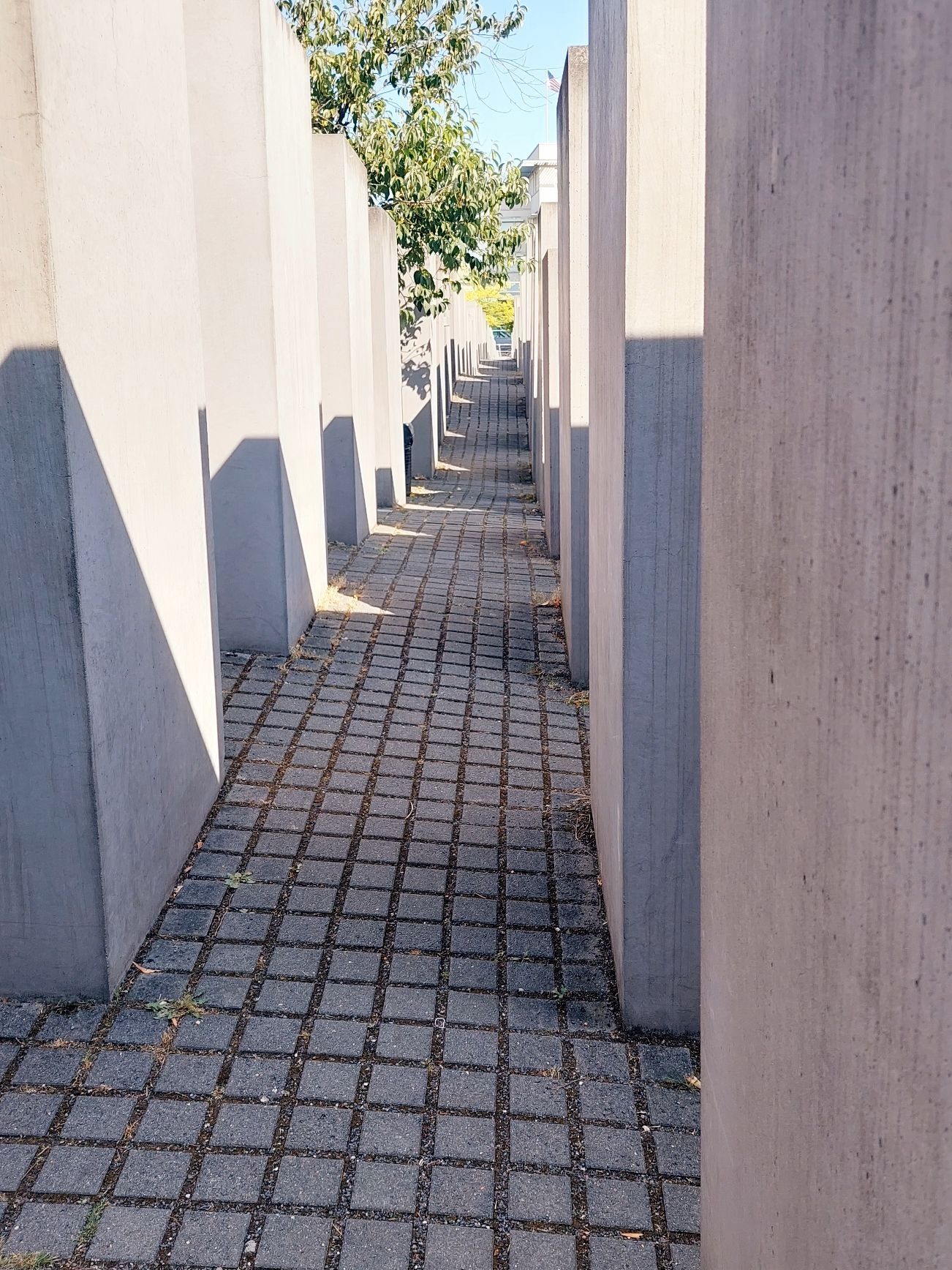 Ajunși în zona centrală am revăzut, pe lumină, Poarta Branderburg. În apropiere am găsit Memorialul Holocaustului, un labirint care comemorează milioanele de evrei uciși de naziști. Locul este impresionant. Lespezi de diferite dimensiuni sunt așezate pe un teren denivelat. Ele dau vizitatorului un sentiment de dezorientare și instabilitate. Intrarea este liberă. Iar la câteva străzi distanță, printre blocuri, am dat de un panou informativ cu locația buncărului lui Hitler. Doar panoul mai amintea de acest loc.