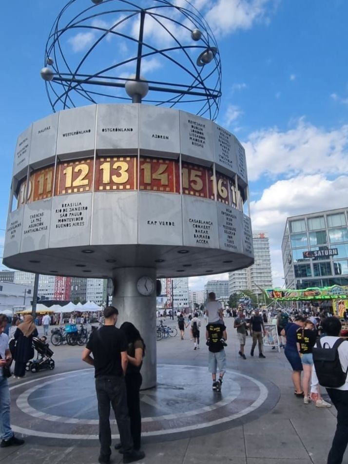 Alexanderplatz este cea mai cunoscută zonă a Berlinului de Est. În acele vremuri a fost un model de arhitectură comunistă. Aici ies în evidență două clădiri: Turnul TV și Ceasul Lumii. Pe frontispiciul acestui ceas apar nume de orașe aflate pe diferite fuse orare. În 1969, acestea au fost alese pe criterii politice.
