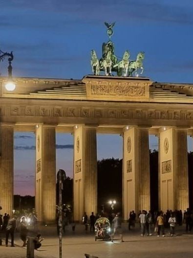Poarta Brandenburg este monumentul care a marcat de-a lungul istoriei Germaniei pacea, victoria, divizarea si apoi reunificarea. În vremea comunismului Poarta Brandenburg se afla chiar pe granița dintre Est și Vest. Am găsit-o asediată de turiștii care fotografiau sau filmau. Frumos luminat monumentul își profila coloanele și carul zeiței Victoria pe cerul senin al serii de vară.