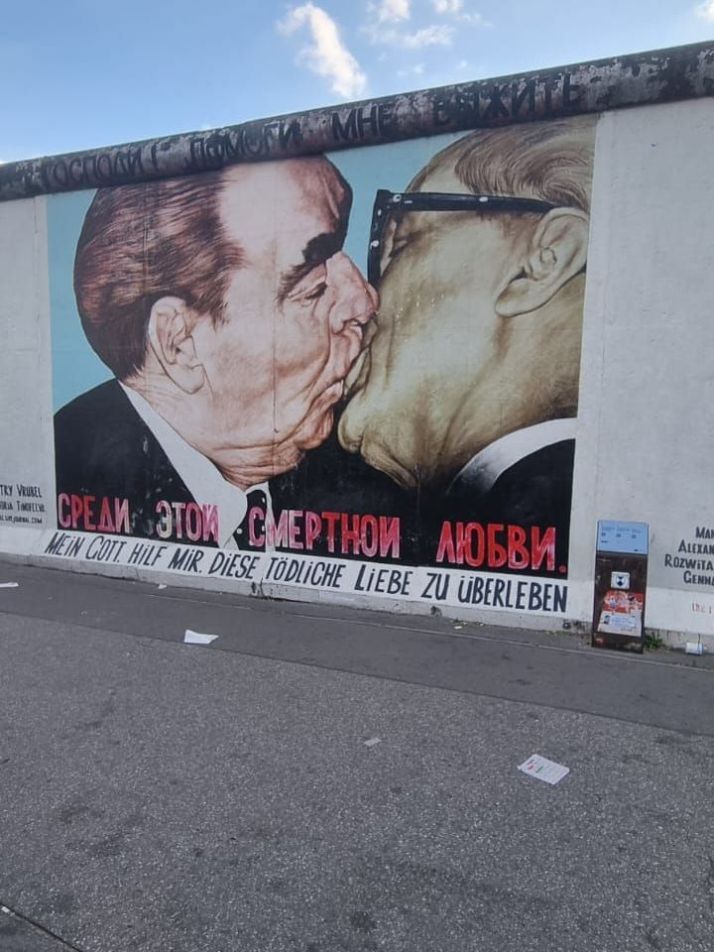 Am făcut ultimul popas din această lungă zi la East Side Gallery. Este o secțiune a Zidului Berlinului rămasă în picioare și acoperită cu tablouri în graffiti. Și binențeles l-am fotografiat pe cel mai cunoscut.
