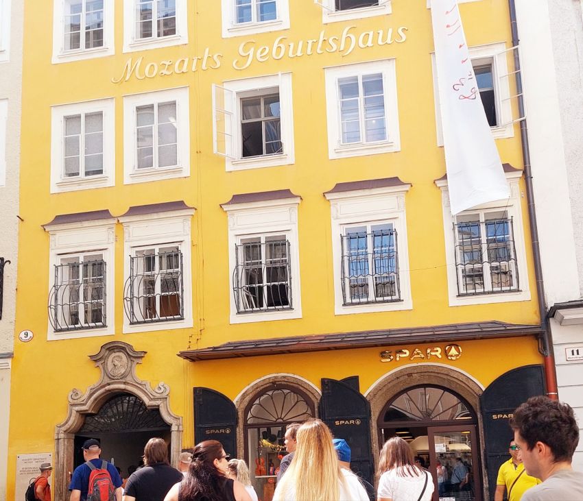 Centrul vechi al Salzburgului– o frumusețe, parte a Patrimoniului UNESCO! Aici veți vedea clădiri vechi în stil baroc frumos renovate, biserici, magazine, piațete, restaurante, suveniruri și o mare de turiști. Am admirat din exterior clădirea unde s-a născut Mozart. Și aici lume cât cuprinde! Am înțeles că familia Mozart ocupa pe vremuri etajul al 3lea al clădirii. În timpul celui de-al Doilea Război Mondial, o bombă a distrus trei sferturi din casa de pe Getreidegasse. Aceasta este strada pe care se află clădirea, cea mai importantă din centrul vechi, astăzi stradă comercială aglomerată. La momentul actual întregul imobil este amenajat ca muzeu dedicat celebrului fiu al Salzburgului.